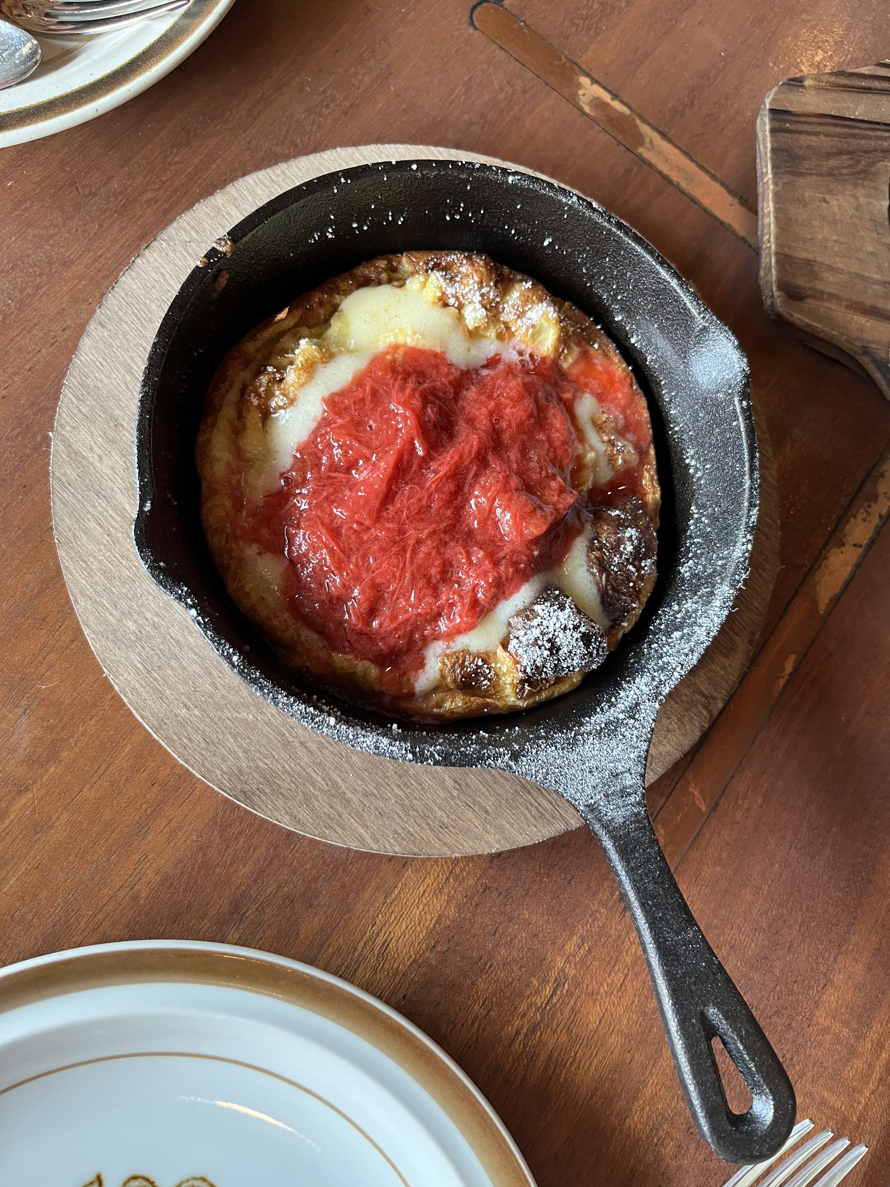 We love rhubarb, so ordering the Dutch Baby came as no surprise. It came piping hot, and how adorable is this dish in that mini cast iron pan!? This was perfectly sweet and balanced and a great break. Our one regret is not eating it faster. We had about three quarters of this dish before taking a break for our next one, and that was a mistake. The dutch part of this baby turned a bit chewy and spongy after sitting out for maybe half an hour, so this is not something you’d want to take home as leftovers. (On the other hand, the Juk held up very well in our fridge!) But with something as sweet and delicious like this, I’m not sure how it could ever make it to being a leftover.