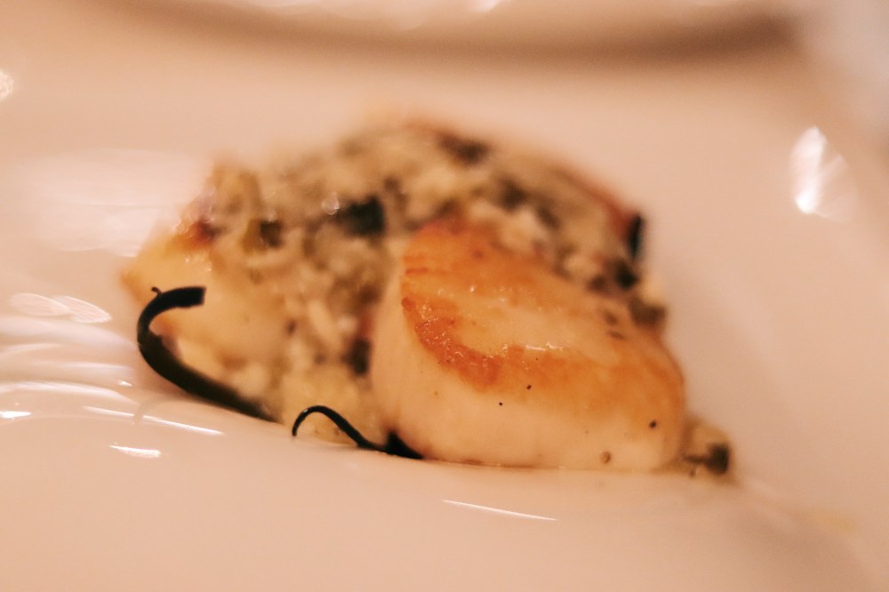 Up next we tried the scallops because we absolutely adore scallops. Amy thought they were kind of fishy, but I’m not sure if I agree. We often struggle buying scallops because Amy can make a mean scallop at home. Although these were delicious, were they worth the price tag over what we can make at home? They served us 3 scallops for $24, and the same quantity of fresh scallops for us in the past has been $22.50, pre-tax. I think we have a pretty even match here, so I’m not sure if that pushes us onto the side of Maison Margaux as the winner or not. These scallops also came with some strange garnishes that I tried to eat, but I think it was a stick? I wouldn’t recommend doing that. Overall, they are perfectly fine, and decently priced.