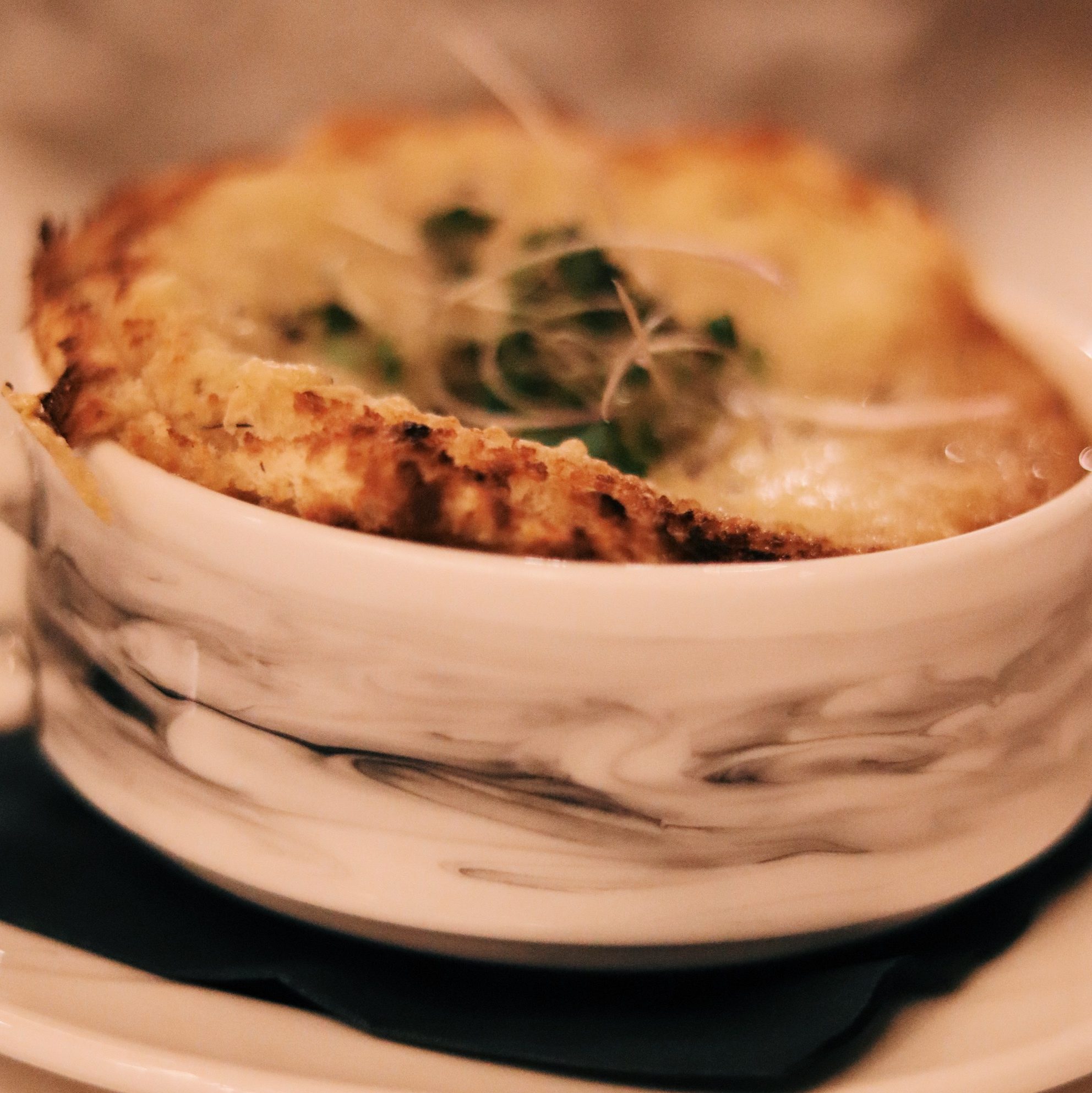 Next we had the “Soupe A L’oignon Gratinee”, or French Onion Soup for the rest of us. It certainly was a French onion soup, and there’s not much else we have to say about it. It was delicious, we slurped it right up, and if it was presented in front of us we would happily eat it again. Nothing to drive you to go visit a restaurant, because many places can make a mean onion soup.