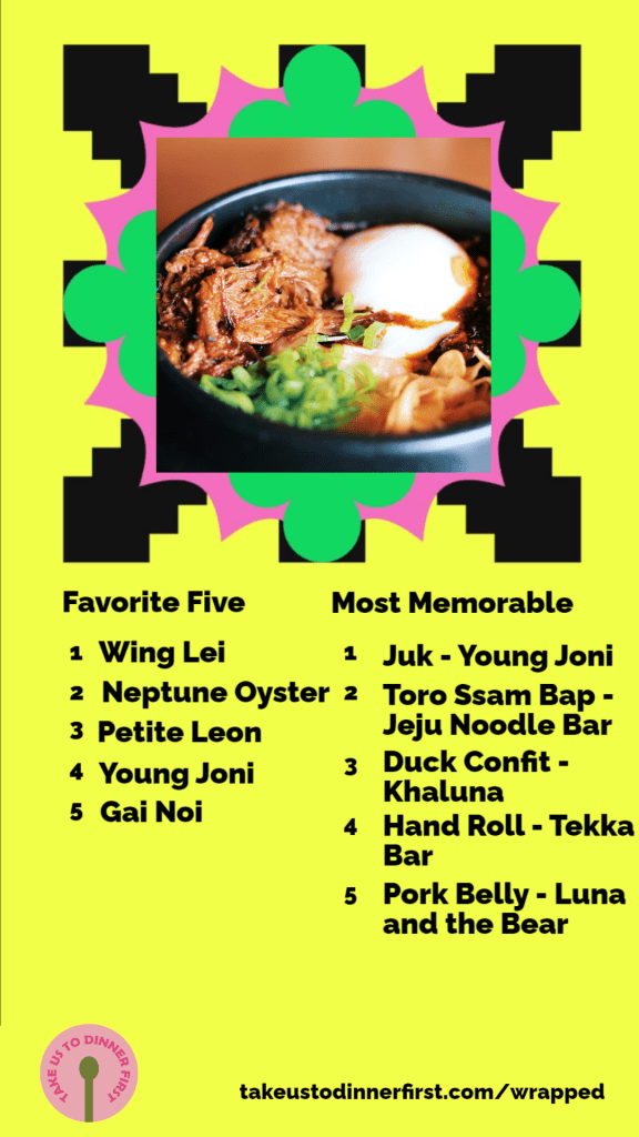 Not clickbait we spent $17,642 on food and drinks this year 🤫 Our top restaurants are listed based on spend, with oddly one from each of our top cities. Shoutout Demi located in our home city of Minneapolis for making the cut. While we enjoyed all of these restaurants, only Wing Lei made it to our favorite restaurants of the year. With that, let’s dive into our favorite restaurants and items.